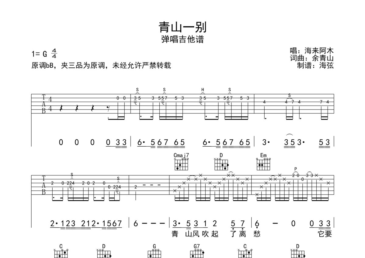海来阿木《青山一别》吉他谱 - G调弹唱六线谱