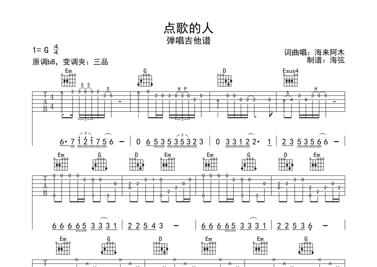 海来阿木《点歌的人》吉他谱 - G调弹唱六线谱