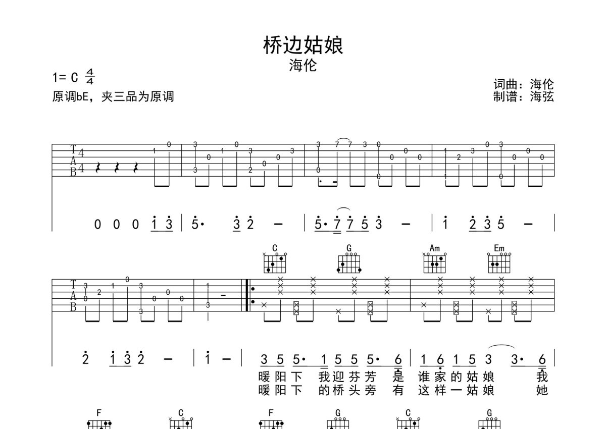 海伦《桥边姑娘》吉他谱 - C调弹唱六线谱