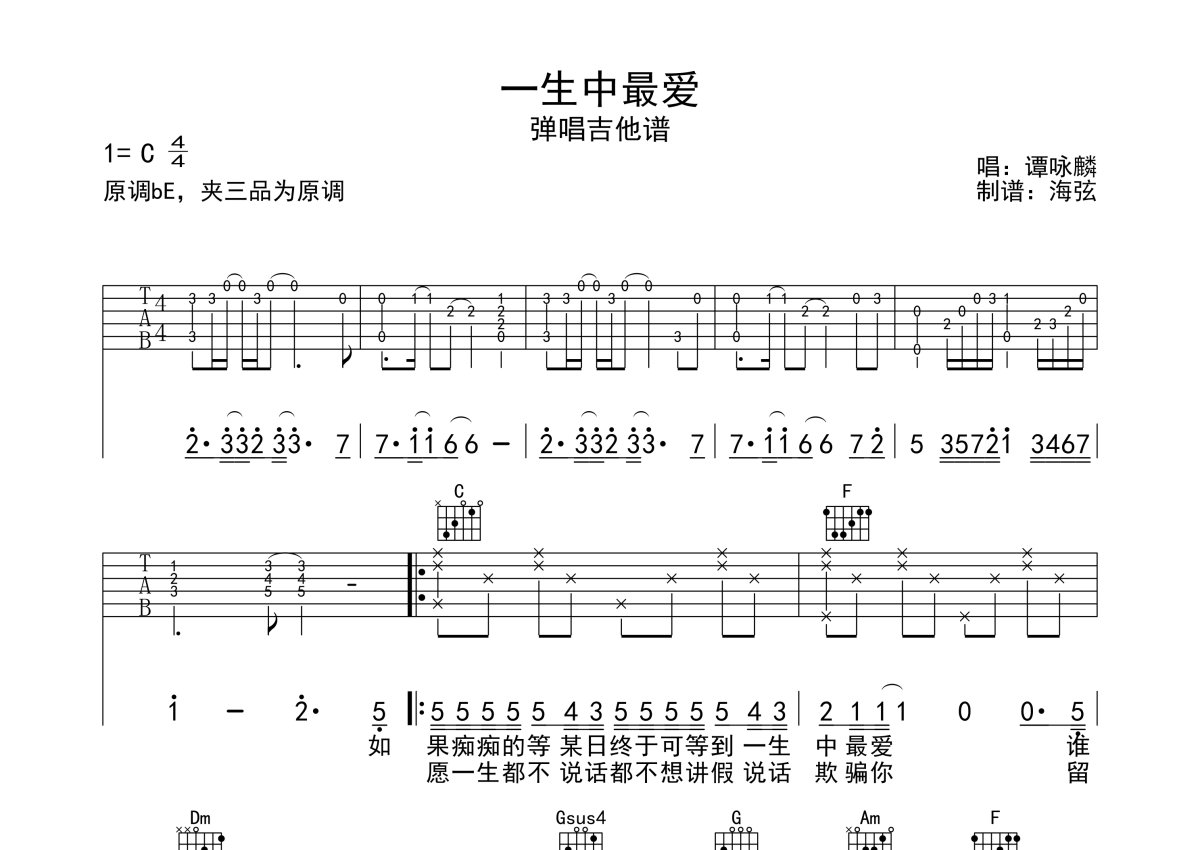 谭咏麟《一生中最爱》吉他谱 - C调弹唱六线谱