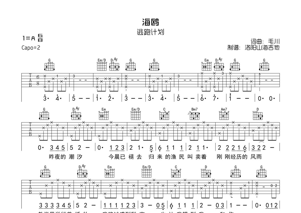 逃跑计划《海鸥》吉他谱 - G调弹唱六线谱