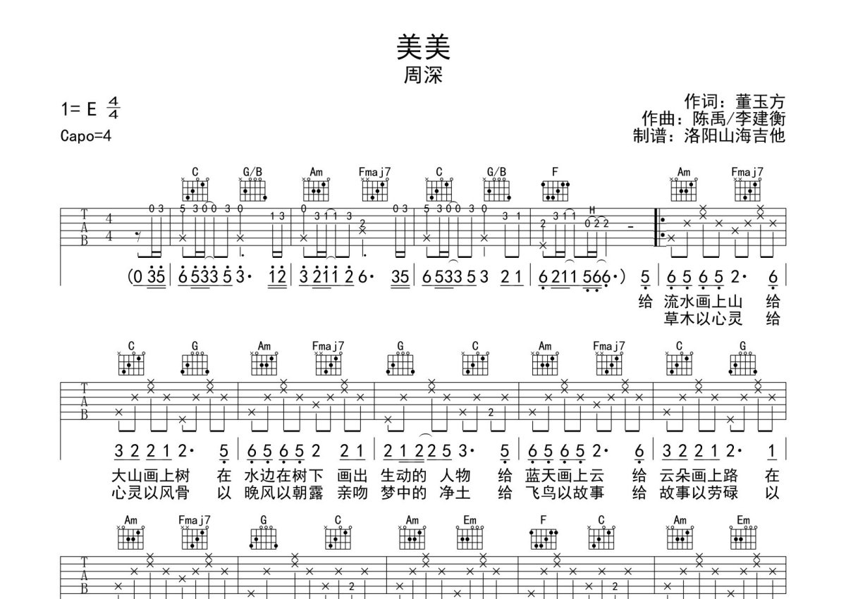 《美美》是周深演唱的一首歌曲,本吉他谱采用的是C调指法编配,这份吉他谱共有两张高清图谱,图谱由 @何奔洋 编配上传,图谱使用六线谱编配,包含吉他和弦指法、简谱以及歌词部分,使用这份美美吉他谱,可以让你更加方便地掌握这首歌曲的弹唱技巧,快来尝试吧。周深《美美》吉他弹唱谱,采用C调指法编配,何奔洋编配出品,共有2张高清图谱,免翻页排版设计。