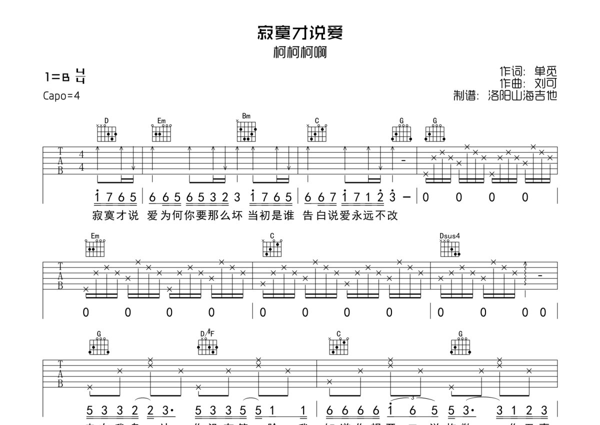 柯柯柯啊《寂寞才说爱》吉他谱 - G调弹唱六线谱