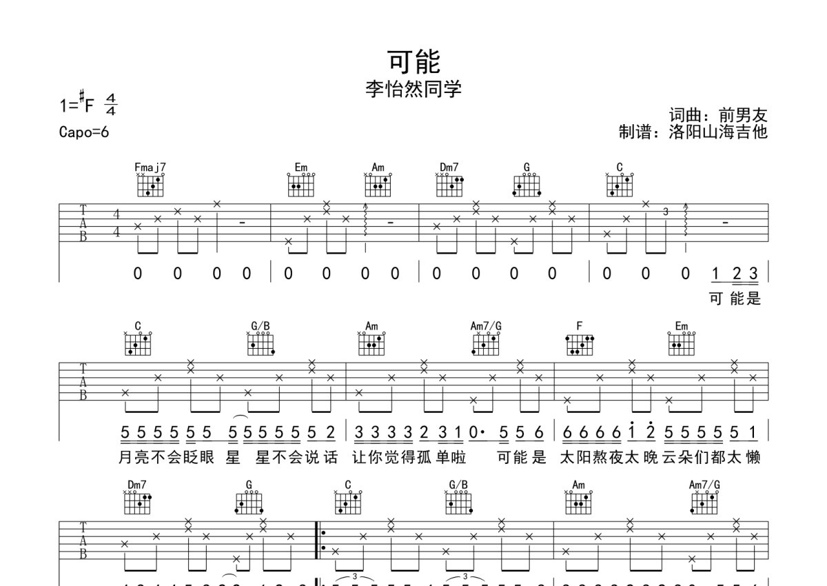 《可能》是李怡然同学演唱的一首歌曲,本吉他谱采用的是C调指法编配,这份吉他谱共有两张高清图谱,图谱由 @何奔洋 编配上传,图谱使用六线谱编配,包含吉他和弦指法、简谱以及歌词部分,使用这份可能吉他谱,可以让你更加方便地掌握这首歌曲的弹唱技巧,快来尝试吧。李怡然同学《可能》吉他弹唱谱,采用C调指法编配,何奔洋编配出品,共有2张高清图谱,免翻页排版设计。