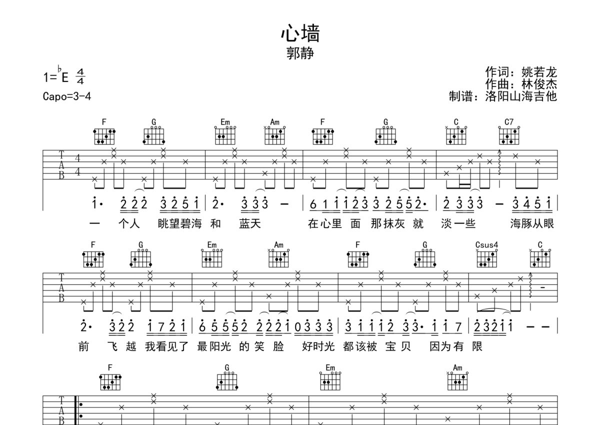 郭静《心墙》吉他谱 - C调弹唱六线谱