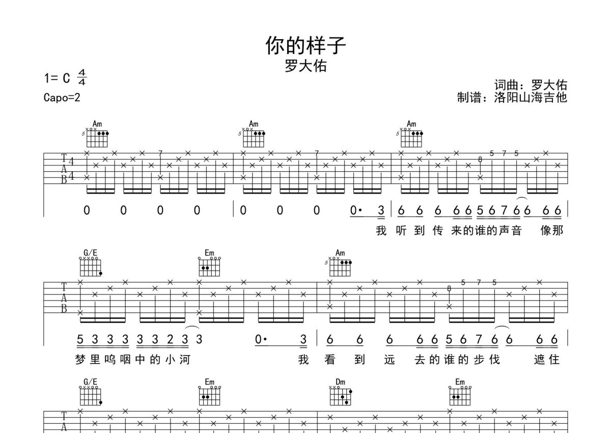 《你的样子》是罗大佑演唱的一首歌曲,本吉他谱采用的是C调指法编配,这份吉他谱共有两张高清图谱,图谱由 @何奔洋 编配上传,图谱使用六线谱编配,包含吉他和弦指法、简谱以及歌词部分,使用这份你的样子吉他谱,可以让你更加方便地掌握这首歌曲的弹唱技巧,快来尝试吧。罗大佑《你的样子》吉他弹唱谱,采用C调指法编配,何奔洋编配出品,共有2张高清图谱,免翻页排版设计。