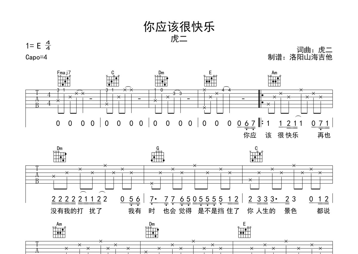 虎二《你应该很快乐》吉他谱 - C调弹唱六线谱