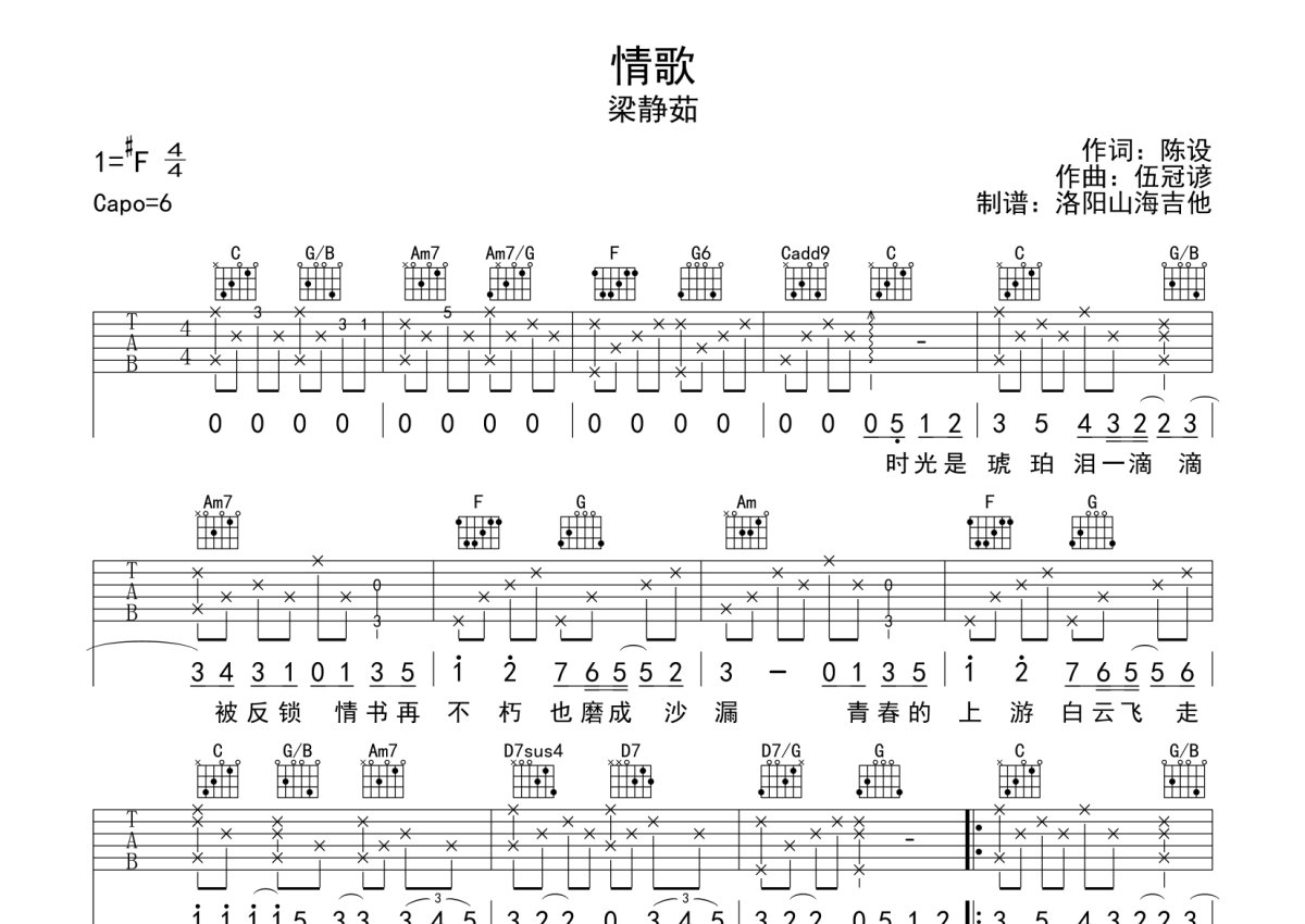 《情歌》是梁静茹演唱的一首歌曲,本吉他谱采用的是C调指法编配,这份吉他谱共有两张高清图谱,图谱由 @何奔洋 编配上传,图谱使用六线谱编配,包含吉他和弦指法、简谱以及歌词部分,使用这份情歌吉他谱,可以让你更加方便地掌握这首歌曲的弹唱技巧,快来尝试吧。梁静茹《情歌》吉他弹唱谱,采用C调指法编配,何奔洋编配出品,共有2张高清图谱,免翻页排版设计。