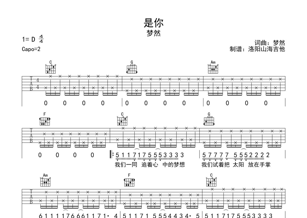 梦然《是你》吉他谱 - C调弹唱六线谱