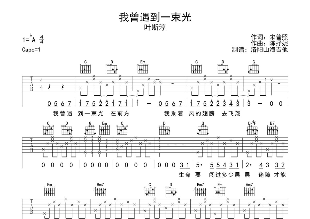 叶斯淳《我曾遇到一束光》吉他谱 - G调弹唱六线谱