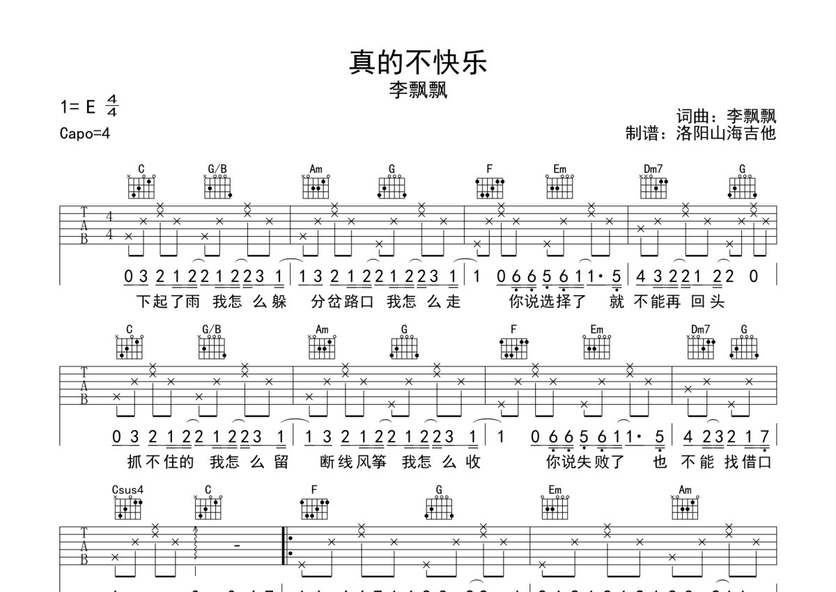 李飘飘《真的不快乐》吉他谱 - C调弹唱六线谱