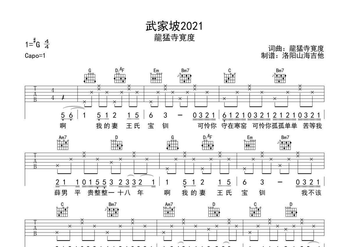 龍猛寺寛度《武家坡2021》吉他谱 - G调弹唱六线谱
