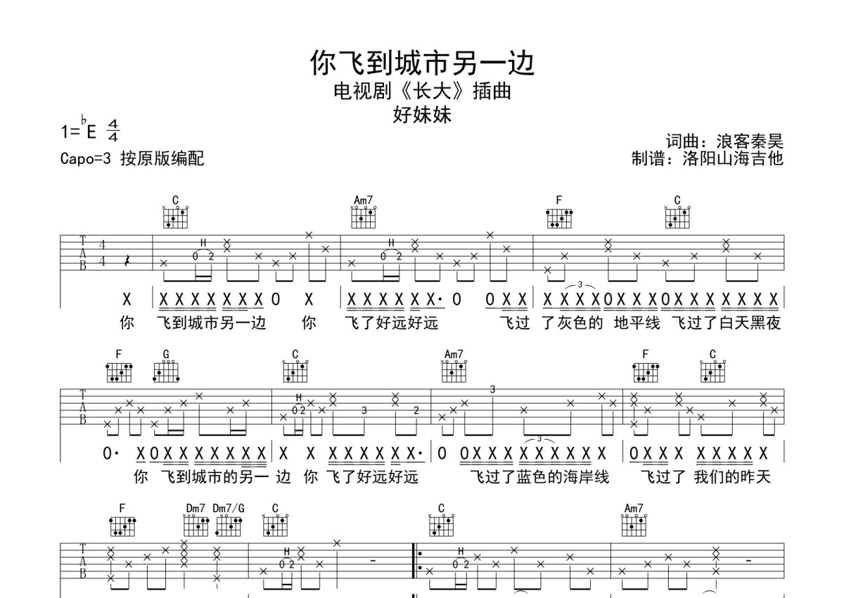 好妹妹《你飞到城市另一边》吉他谱 - C调弹唱六线谱