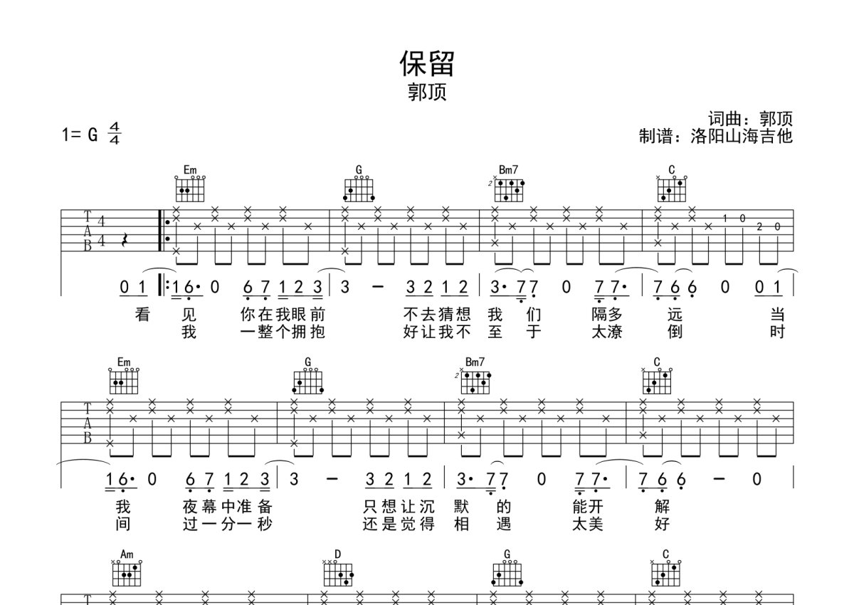 郭顶《保留》吉他谱 - G调弹唱六线谱