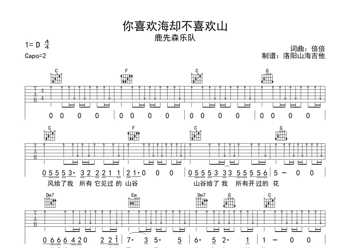 鹿先森乐队《你喜欢海却不喜欢山》吉他谱 - C调弹唱六线谱