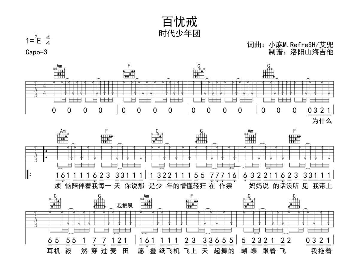 时代少年团《百忧戒》吉他谱 - C调弹唱六线谱