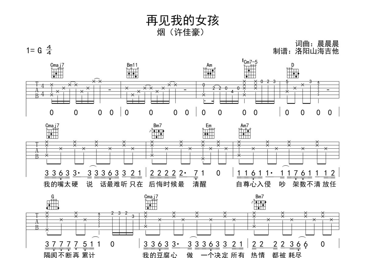 烟(许佳豪)《再见我的女孩》吉他谱 - G调弹唱六线谱