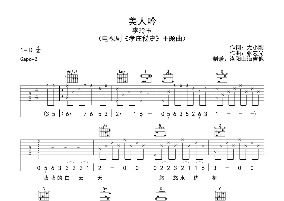《美人吟》是李玲玉演唱的一首歌曲,本吉他谱采用的是C调指法编配,这份吉他谱共有两张高清图谱,图谱由 @何奔洋 编配上传,图谱使用六线谱编配,包含吉他和弦指法、简谱以及歌词部分,使用这份美人吟吉他谱,可以让你更加方便地掌握这首歌曲的弹唱技巧,快来尝试吧。李玲玉《美人吟》吉他弹唱谱,采用C调指法编配,何奔洋编配出品,共有2张高清图谱,免翻页排版设计。