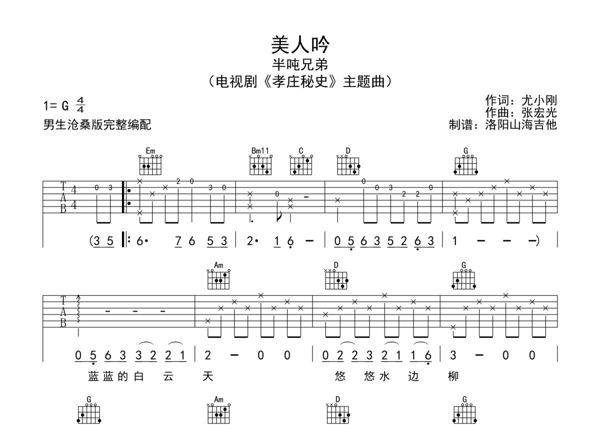半吨兄弟《美人吟》吉他谱 - G调弹唱六线谱