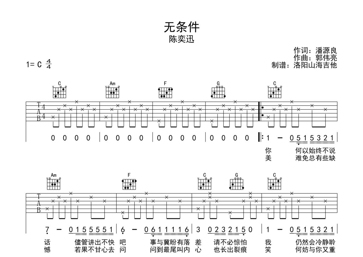 陈奕迅《无条件》吉他谱 - C调弹唱六线谱