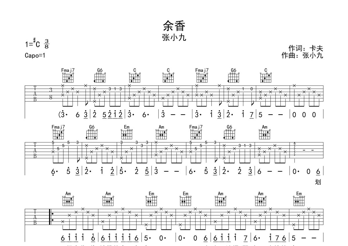 张小九《余香》吉他谱 - C调弹唱六线谱