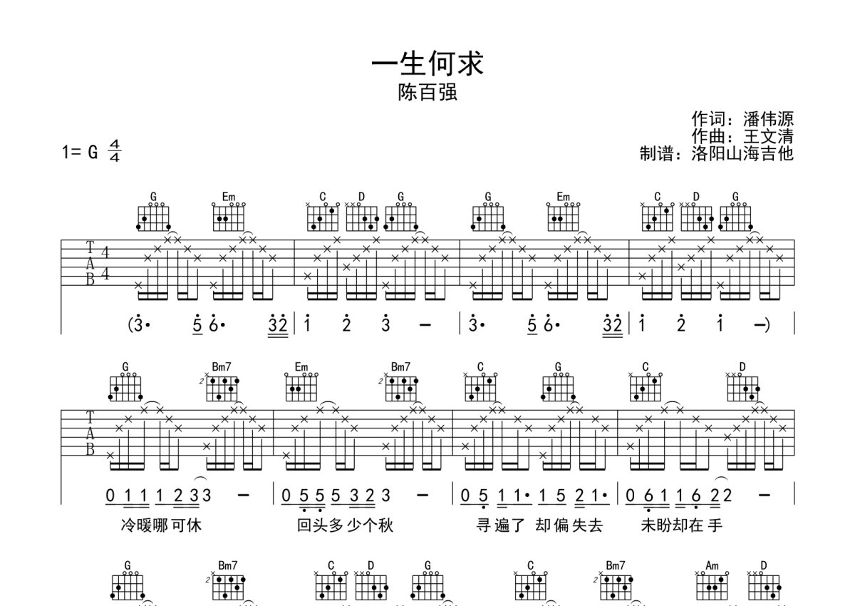 陈百强《一生何求》吉他谱 - G调弹唱六线谱