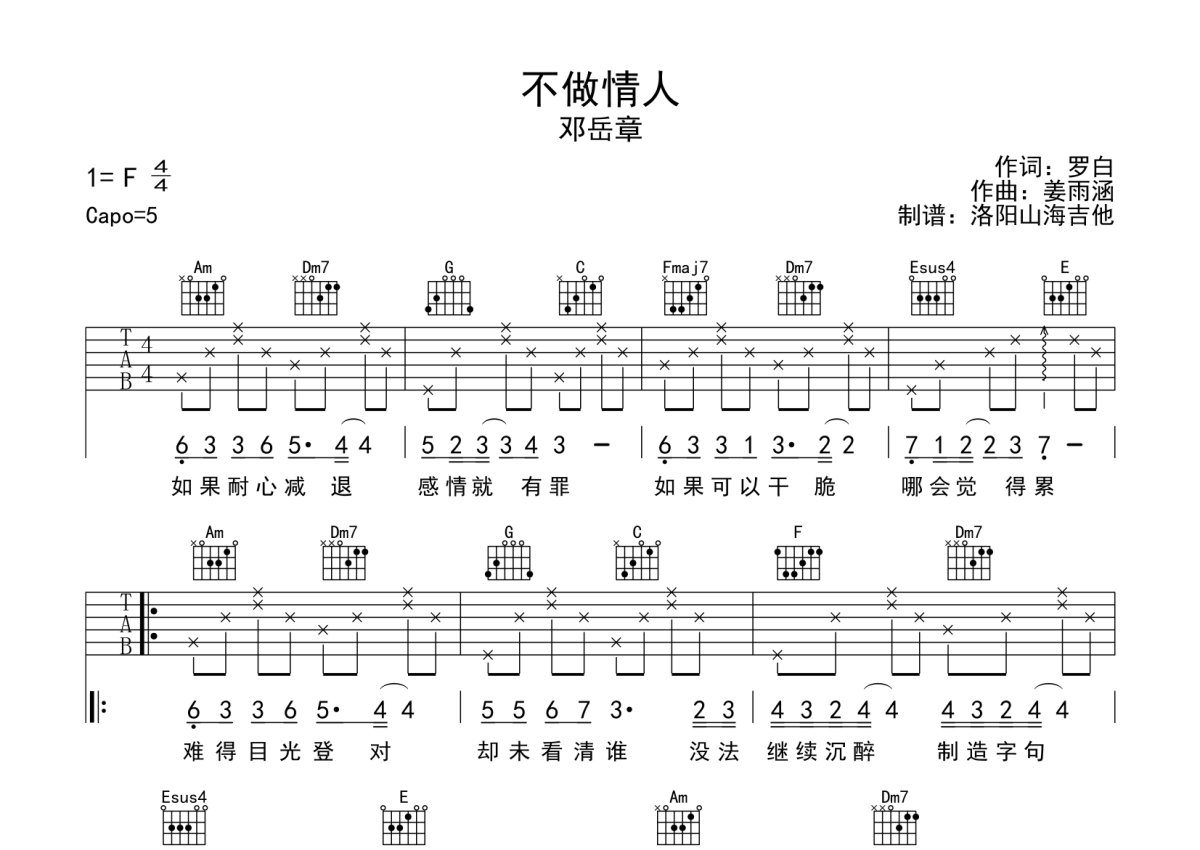 邓岳章《不做情人》吉他谱 - C调弹唱六线谱