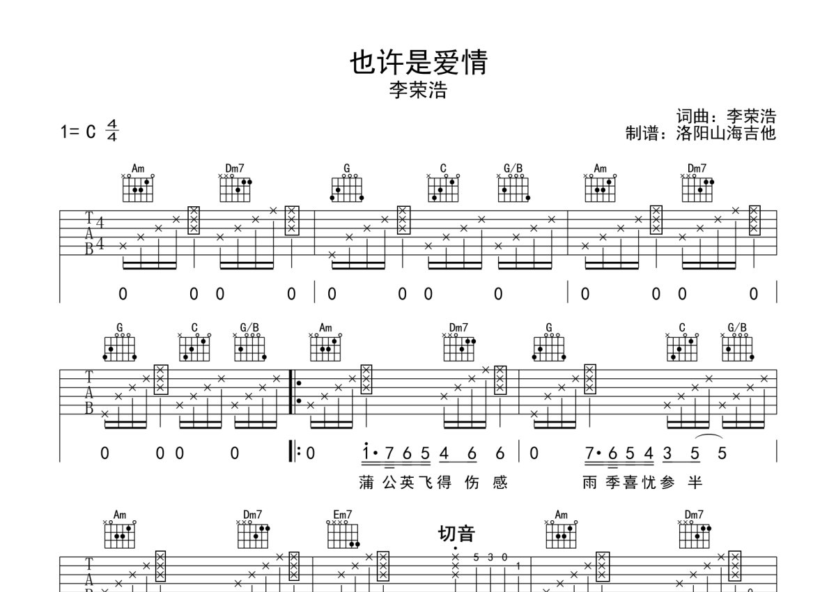 李荣浩《也许是爱情》吉他谱 - C调弹唱六线谱