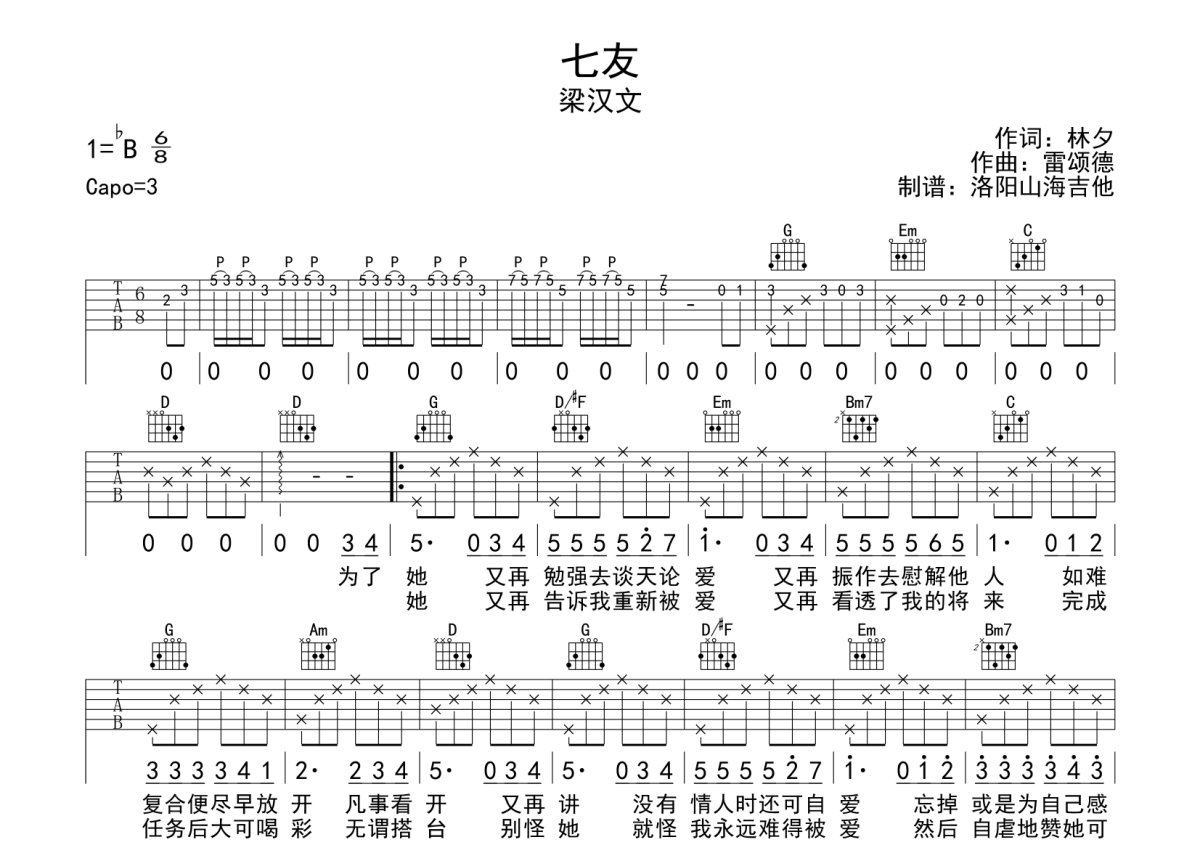 梁汉文《七友》吉他谱 - G调弹唱六线谱