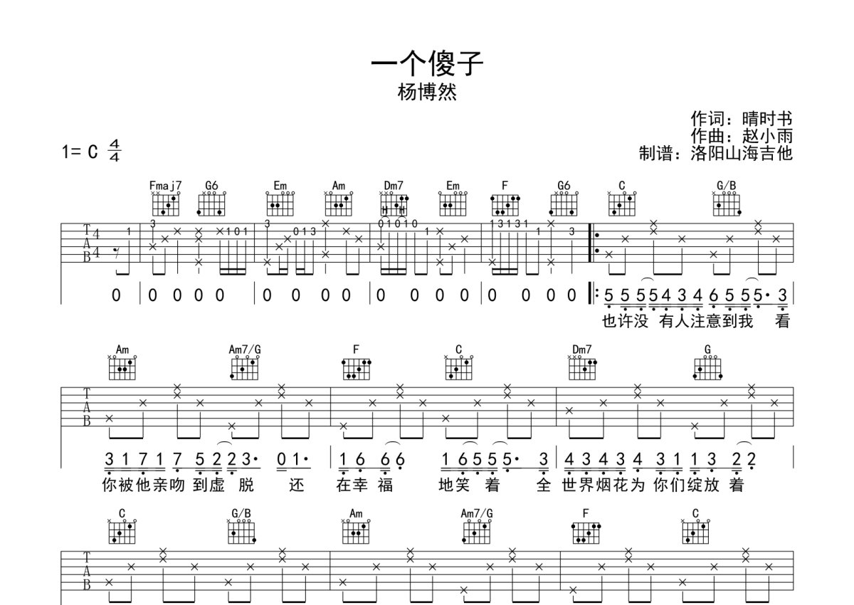 杨博然《一个傻子》吉他谱 - C调弹唱六线谱