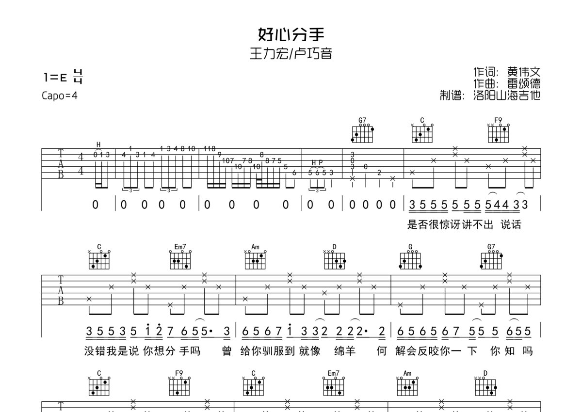 王力宏/卢巧音《好心分手》吉他谱 - C调弹唱六线谱