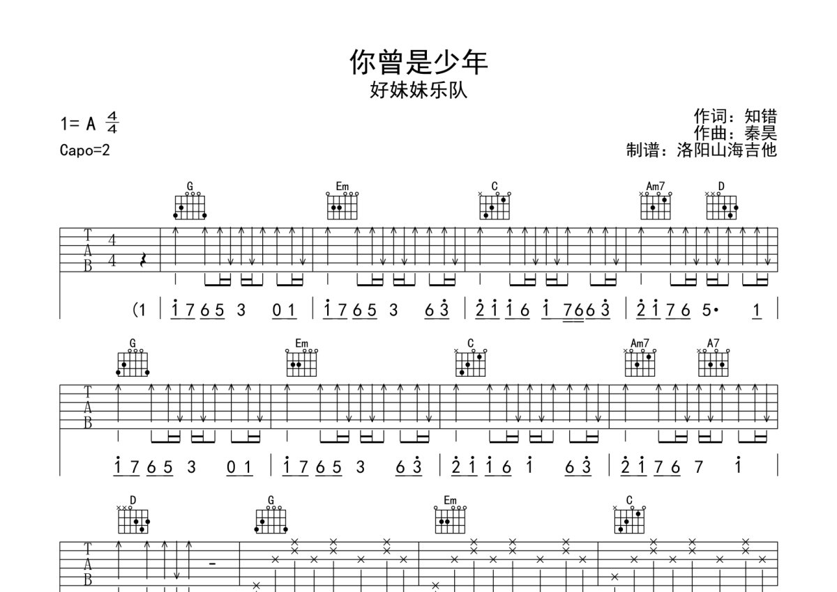 好妹妹《你曾是少年》吉他谱 - G调弹唱六线谱