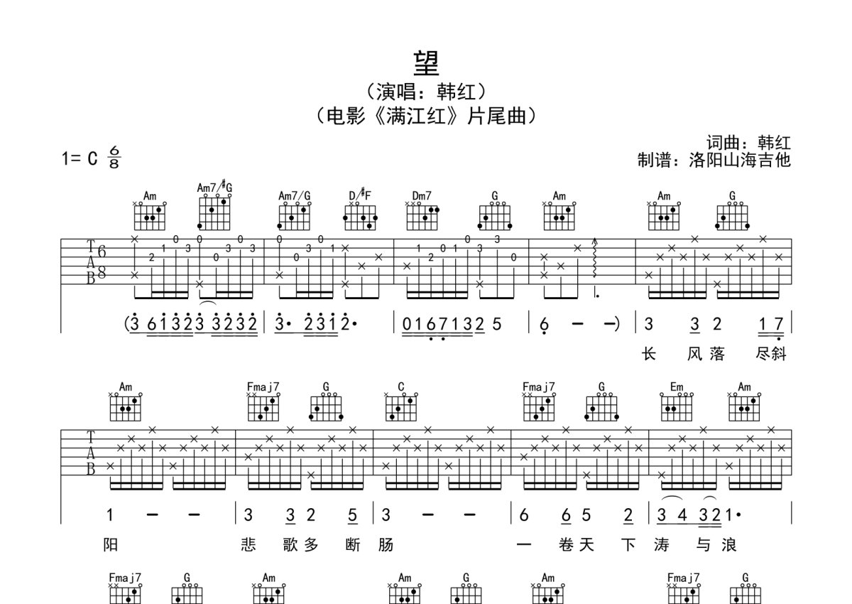 《望》是韩红演唱的一首歌曲,本吉他谱采用的是C调指法编配,这份吉他谱共有两张高清图谱,图谱由 @何奔洋 编配上传,图谱使用六线谱编配,包含吉他和弦指法、简谱以及歌词部分,使用这份望吉他谱,可以让你更加方便地掌握这首歌曲的弹唱技巧,快来尝试吧。韩红《望》吉他弹唱谱,采用C调指法编配,何奔洋编配出品,共有2张高清图谱,免翻页排版设计。