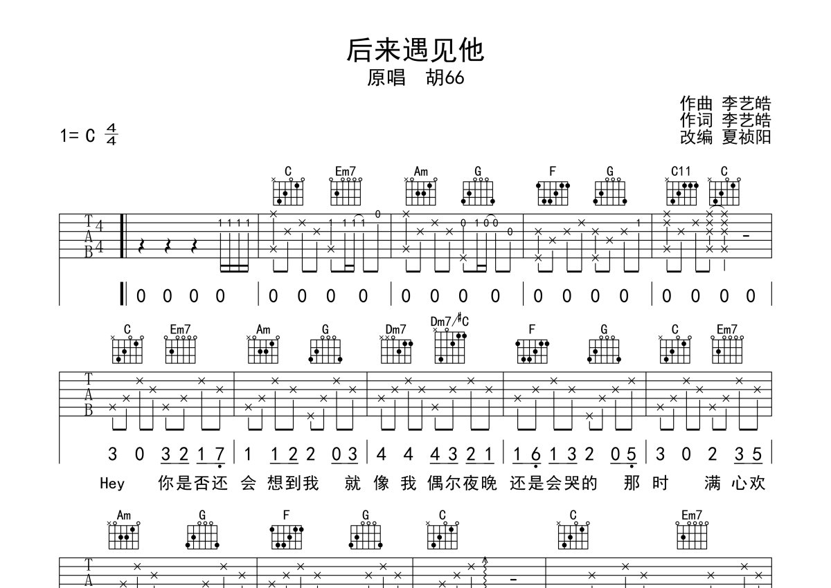 胡66《后来遇见他》吉他谱 - C调弹唱六线谱