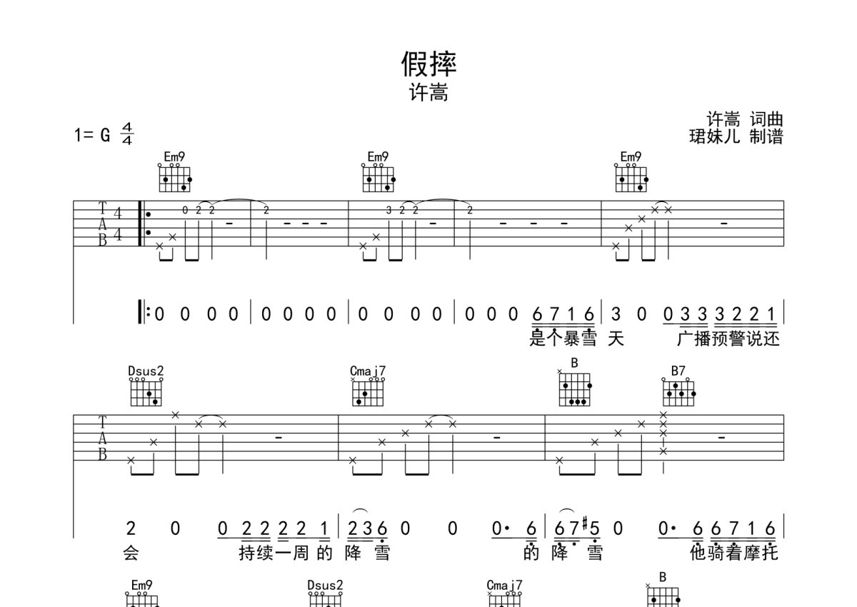 许嵩《假摔》吉他谱 - G调弹唱六线谱