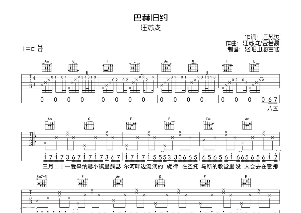 汪苏泷《巴赫旧约》吉他谱 - C调弹唱六线谱