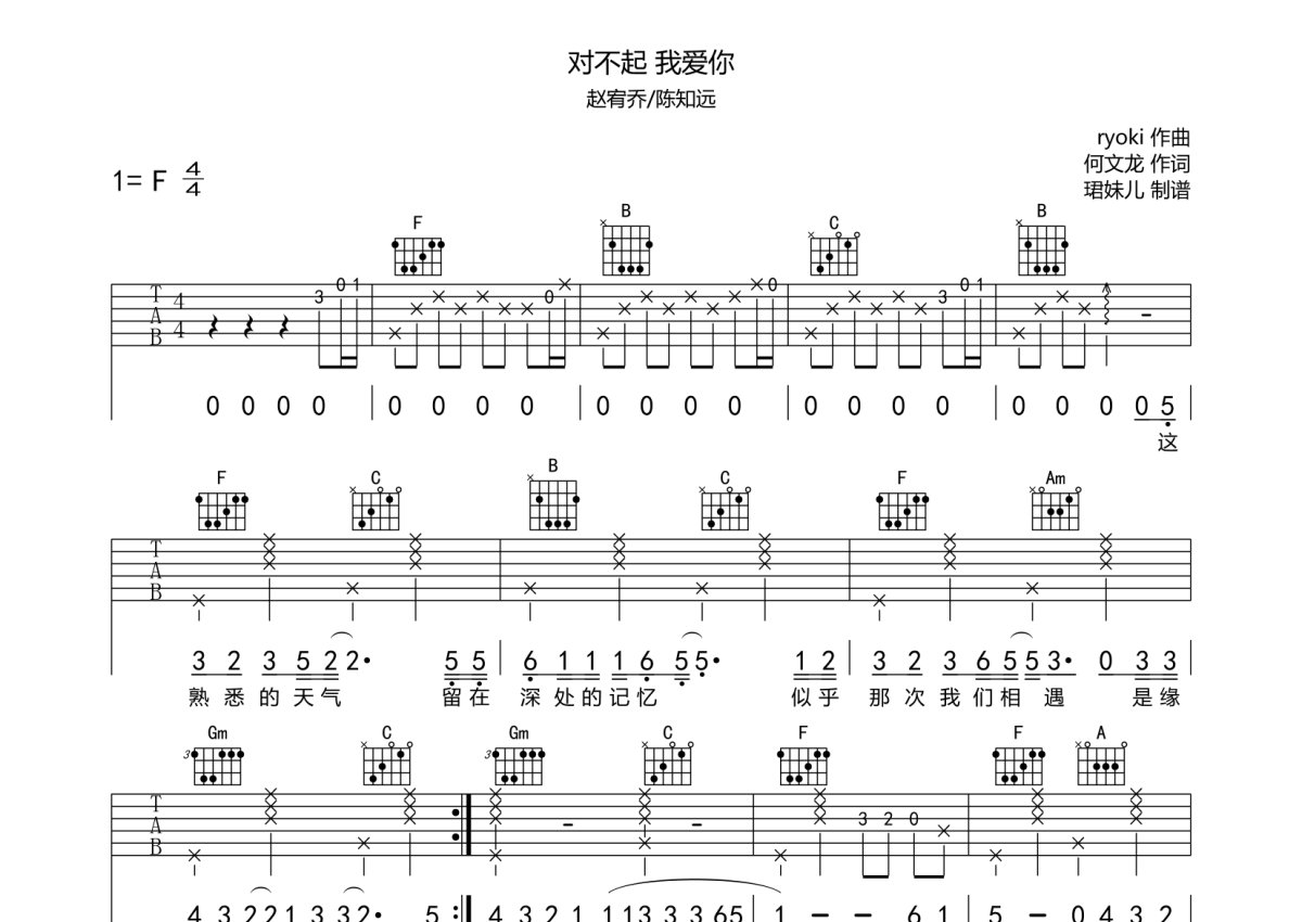 赵宥乔/ 陈知远《对不起 我爱你》吉他谱 - F调弹唱六线谱
