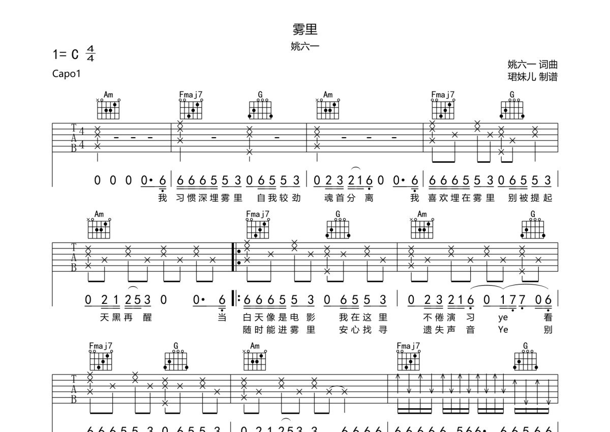 姚六一《雾里》吉他谱 - C调弹唱六线谱