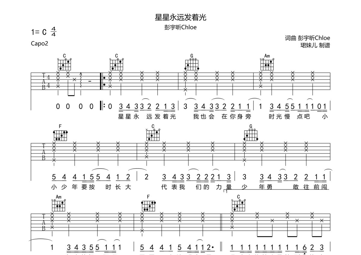 彭宇昕Chloe《星星永远发着光》吉他谱 - C调弹唱六线谱