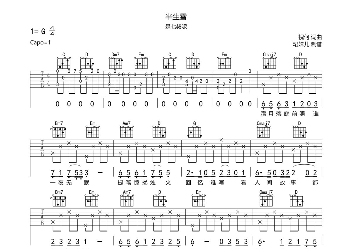《半生雪》是是七叔呢演唱的一首歌曲,本吉他谱采用的是G调指法编配,这份吉他谱共有两张高清图谱,图谱由 @珺妹儿 编配上传,图谱使用六线谱编配,包含吉他和弦指法、简谱以及歌词部分,使用这份半生雪吉他谱,可以让你更加方便地掌握这首歌曲的弹唱技巧,快来尝试吧。是七叔呢《半生雪》吉他谱_G调吉他弹唱谱。