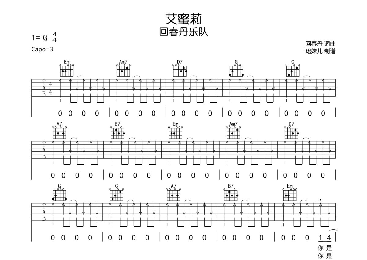 回春丹乐队《艾蜜莉》吉他谱 - G调弹唱六线谱