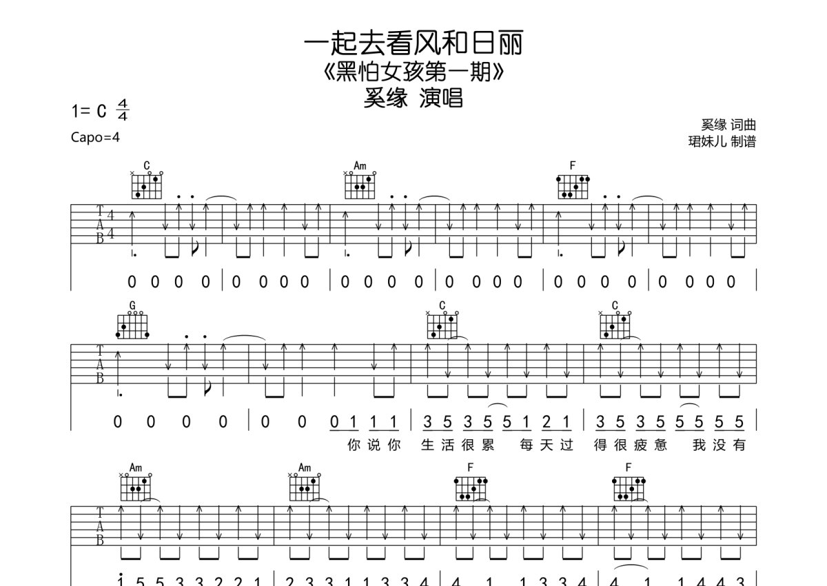 《一起去看风和日丽》是奚缘演唱的一首歌曲,本吉他谱采用的是C调指法编配,这份吉他谱共有四张高清图谱,图谱由 @珺妹儿 编配上传,图谱使用六线谱编配,包含吉他和弦指法、简谱以及歌词部分,使用这份一起去看风和日丽吉他谱,可以让你更加方便地掌握这首歌曲的弹唱技巧,快来尝试吧。奚缘《一起去看风和日丽》吉他谱_C调吉他弹唱谱。