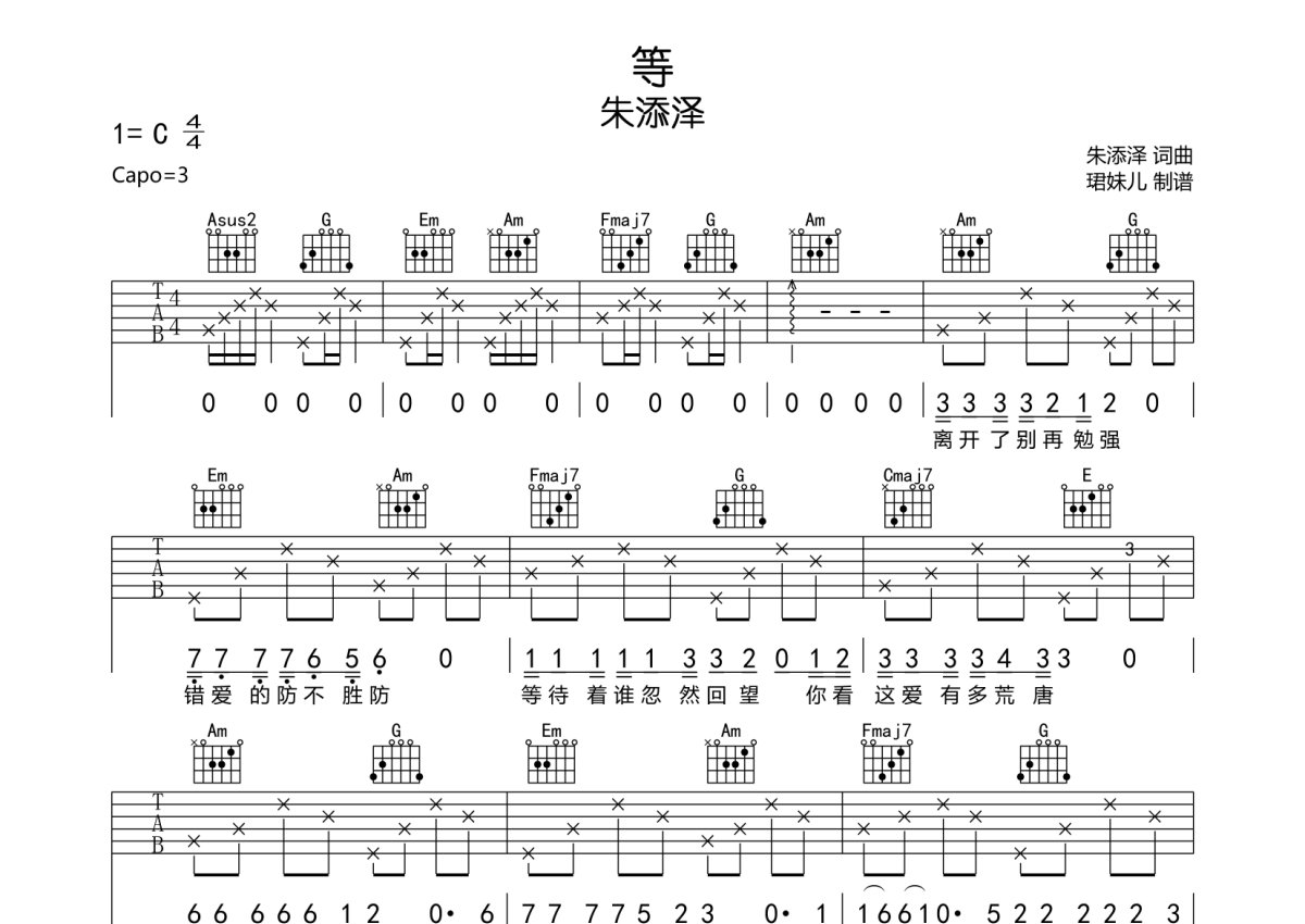 朱添泽《等》吉他谱 - C调弹唱六线谱
