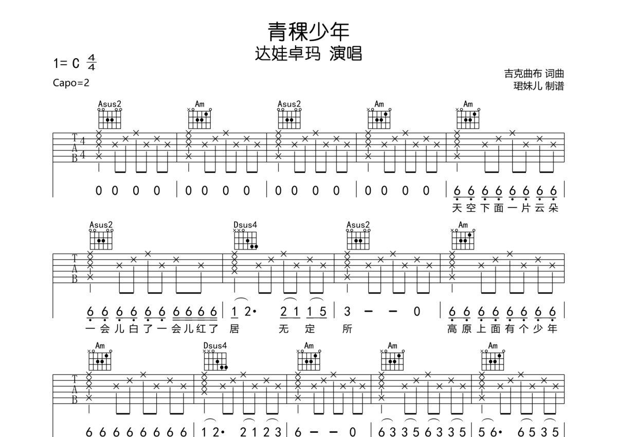 吉克老鹰《青稞少年》吉他谱 - C调弹唱六线谱
