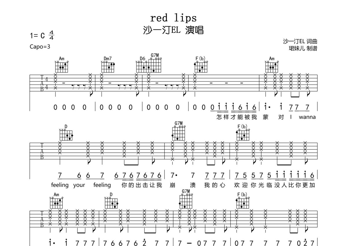 沙一汀EL《red lips》吉他谱 - C调弹唱六线谱