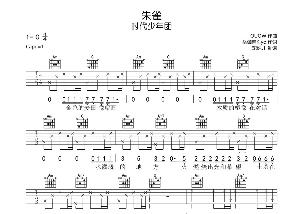 时代少年团《朱雀》吉他谱 - C调弹唱六线谱