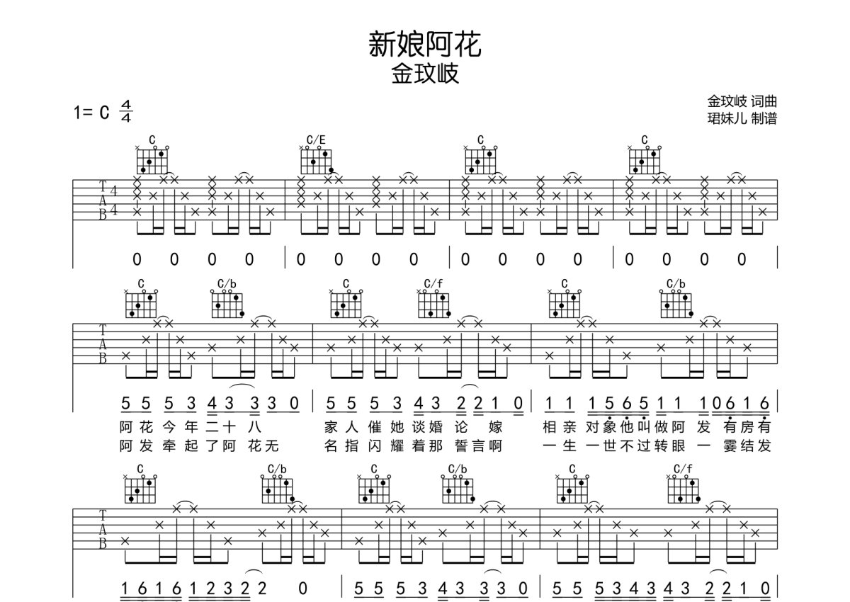 金玟岐《新娘阿花》吉他谱 - C调弹唱六线谱