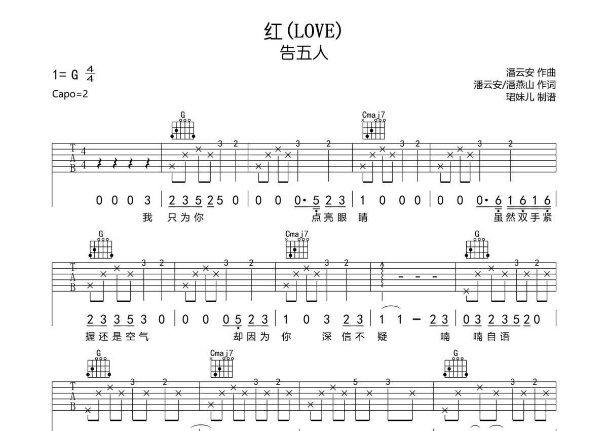 告五人《红(LOVE)》吉他谱 - G调弹唱六线谱