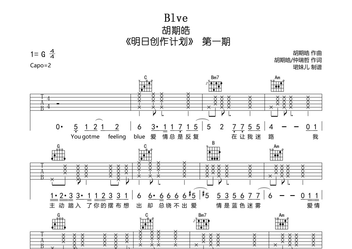 胡期皓《Blve》吉他谱 - G调弹唱六线谱