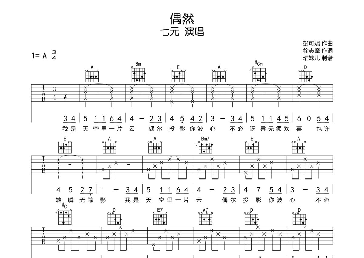 七元《偶然》吉他谱 - A调弹唱六线谱